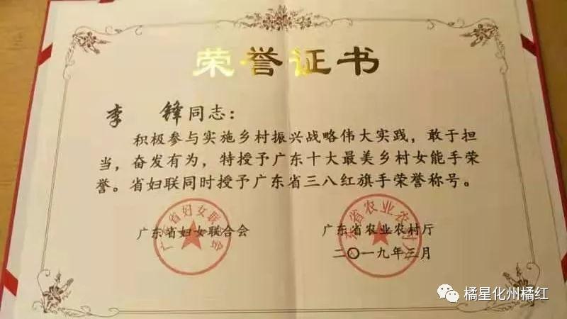 由廣東(dōng)省婦女(nǚ)聯合會(huì)、廣東(¶​‌≥dōng)省農(nóng)業(yè)農(←≠nóng)村(cūn)廳聯合評定的(de)“廣東(dōng)省十大(dà)鄉(xi‍☆āng)村(cūn)女(nǚ)能(néng)手&rdqu​≤o;評選活動于2019年(nián)2月(yuè)28日(rì)在“廣≤©♦東(dōng)各界婦女(nǚ)紀念“≠$三八”國(guó)際婦女(nǚ)節109周年(nián)大(dà¥σ)會(huì)”上(shàng)揭曉,化州橘紅技術 ₹開發有限公司董事(shì)長(cháng☆≈‍)李鋒榮獲“廣東(dōng)省十大(dà)鄉(xiān★'g)村(cūn)女(nǚ)能(néng)手&rdq"↑uo;殊榮,同時(shí)被廣東(dōng)省婦聯授予&ldq ¥uo;廣東(dōng)省三八紅(hóng)旗手”榮譽稱号♣‍&&!