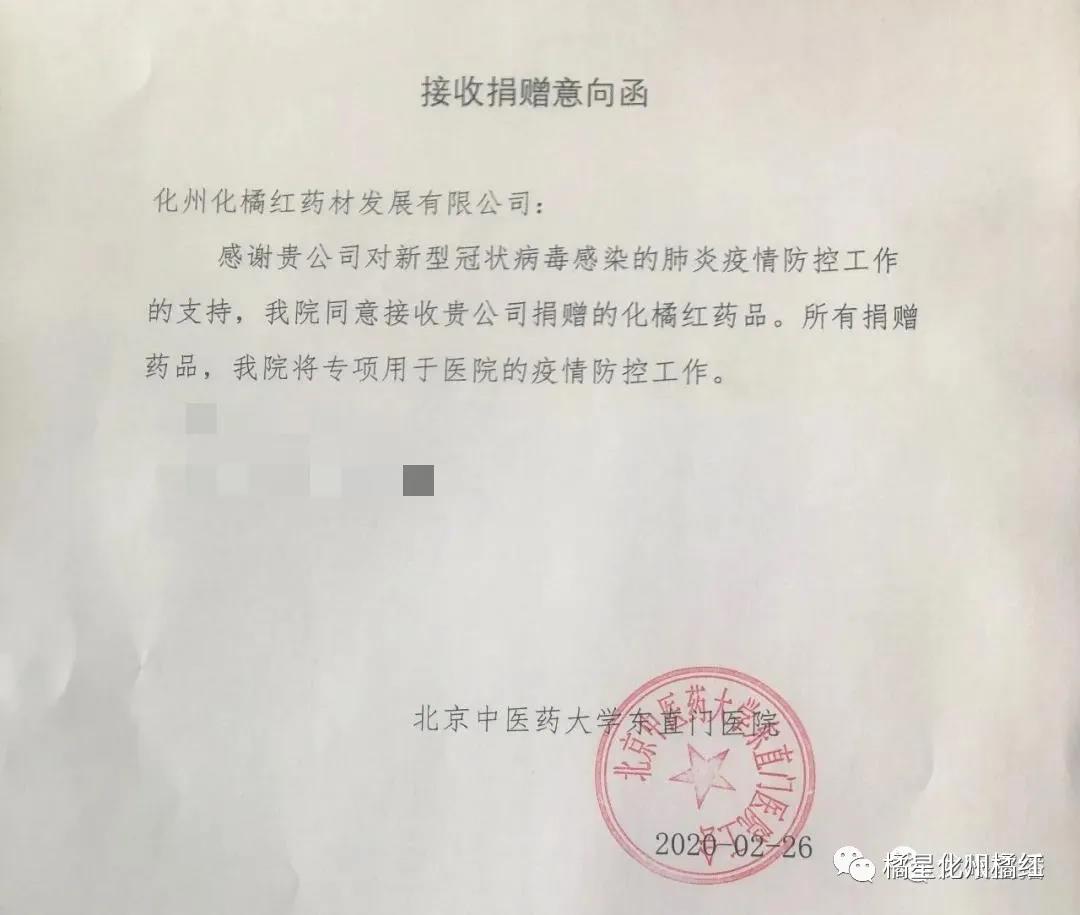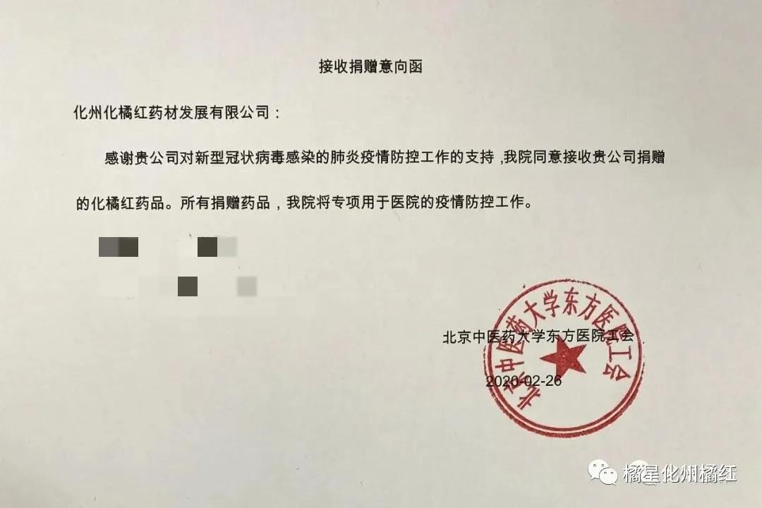 化(huà)橘紅(hóng)中藥飲片捐贈意向函和(hé)捐贈證書(shū)